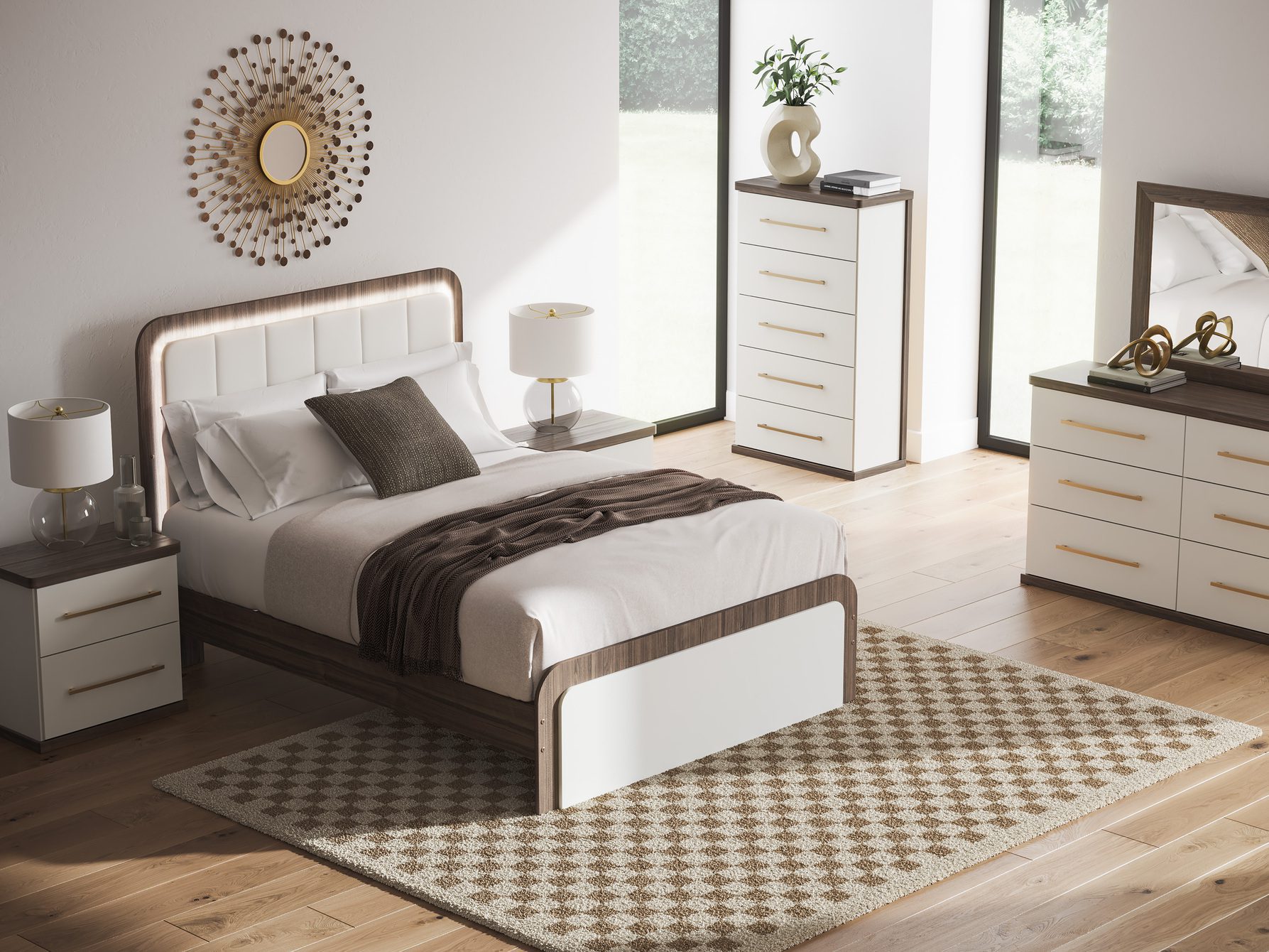 | Bedroom Features | Floating Mirror, LED Lighting, Metal Slats, Platform Bed Option, Panel Bed, USB/Wireless Charging |